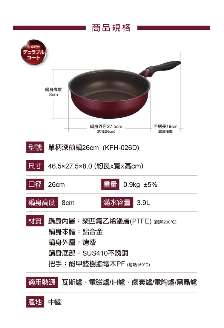 鍋身外層:烤漆/把手:酚甲醛樹脂(電木PF) (耐熱150℃) -