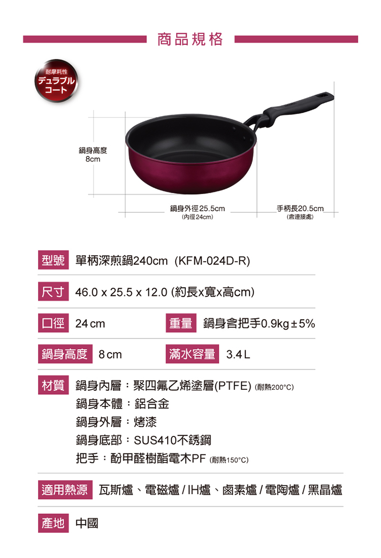 鍋身高度:8cm、把手長度:約20.5cm(含連接處) -