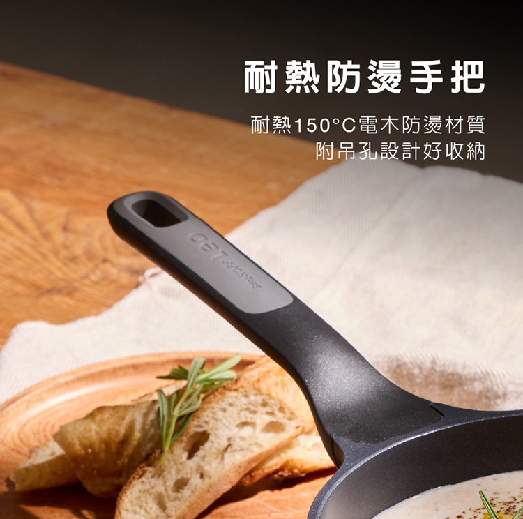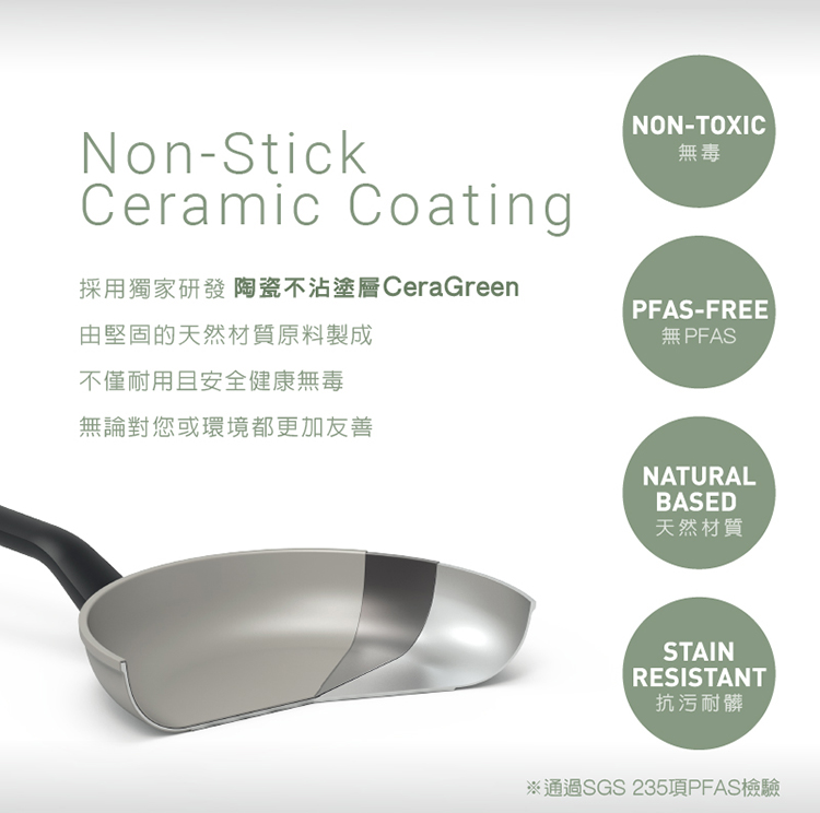 - 鍋身本體:鋁合金/鍋內塗層:陶瓷塗層CeraGreen(耐熱250°C)