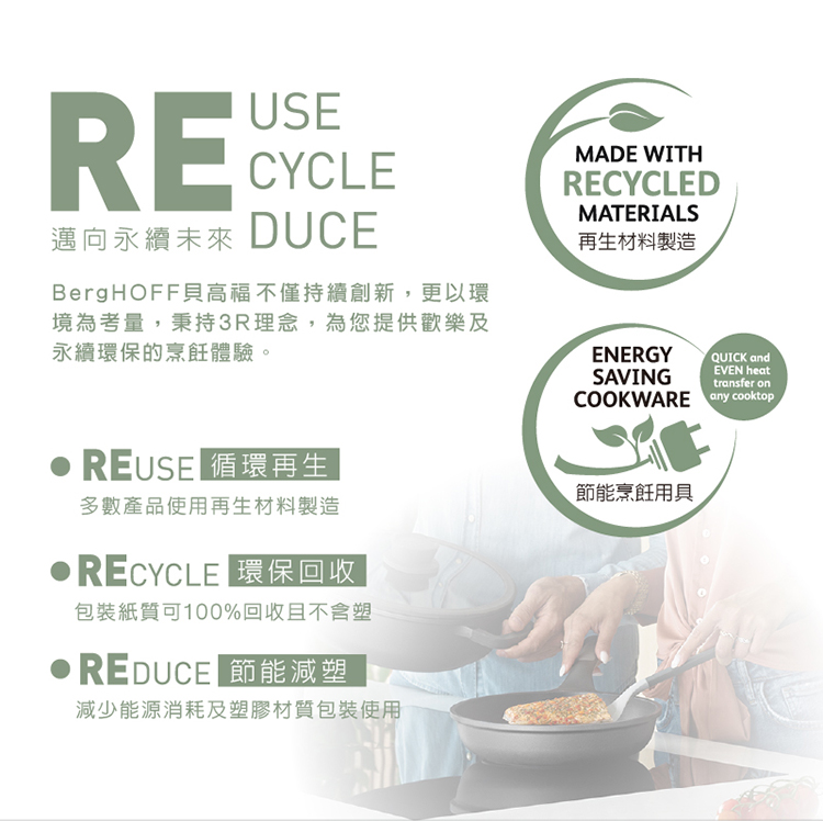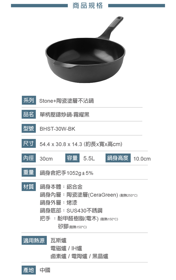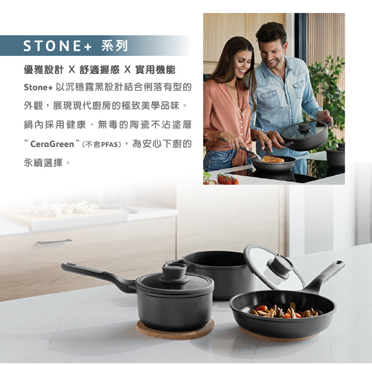 - 鍋身本體:鋁合金/鍋內塗層:陶瓷塗層CeraGreen(耐熱250°C)